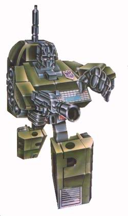 Profile: Brawl is loud. Whether he's talking, shooting, or merely moving, he makes a lot of noise- grating, clanking, booming noise that irritates all those nearby, friend and foe alike. As unpleasant as that side of him is, there are other aspects of his personality that his fellow Combaticons consider even worse. He has a hair trigger temper and expresses his frequent anger with a savage fury truly terrible to behold. But, at least this seething rage that drives him, that makes him so unpleasant to be with also makes him a terrifyingly effective warrior. He makes no secret of his blustering belligerence, the mere sound of his approach is enough to unnerve Autobots. His actual arrival can paralyze them with mind-numbing fear. If he weren't always so angry, Brawl might find this pleasing.